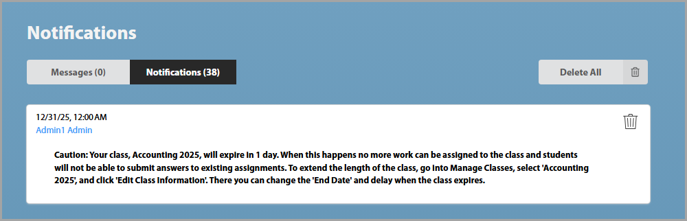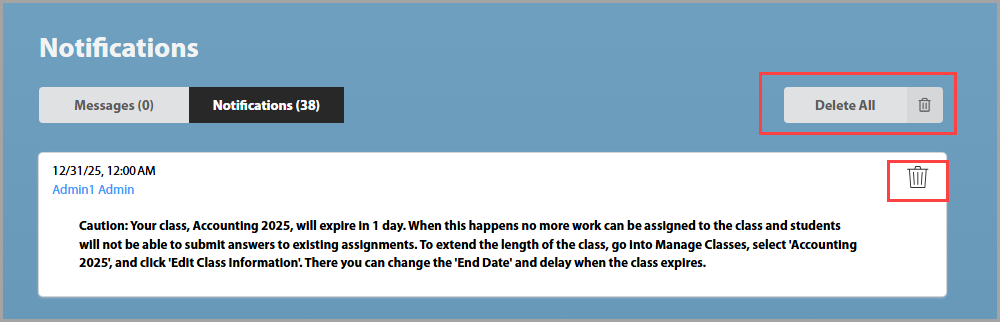 You can delete your notifications by Selecting the trash can icon next to the notification or Delete All if you would like to delete all of them.