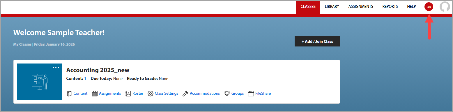 This page shows you important messages about your class and notifications such as when your class is going to expire.
