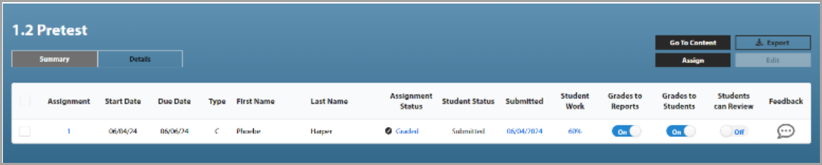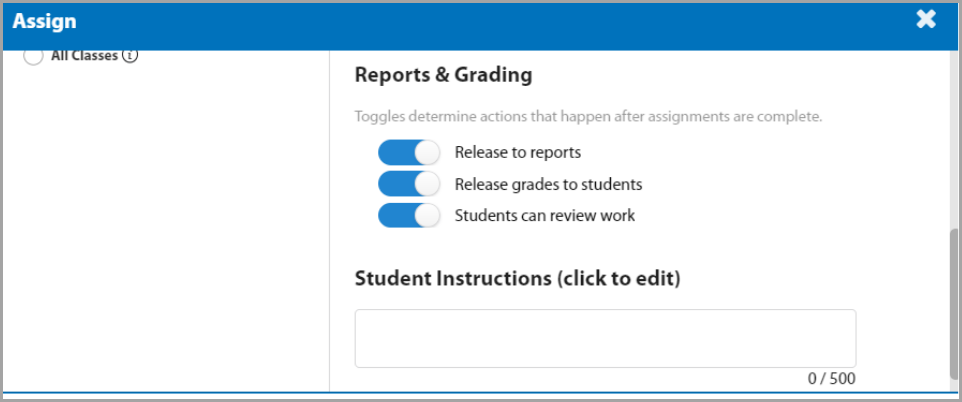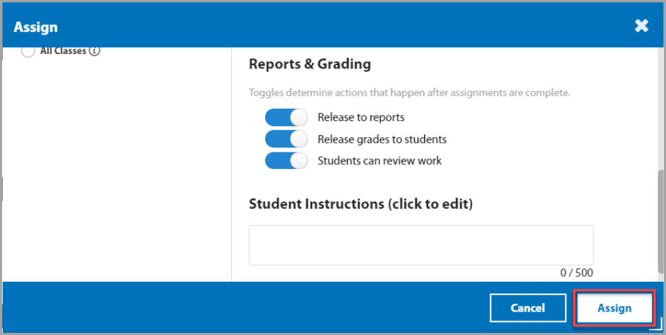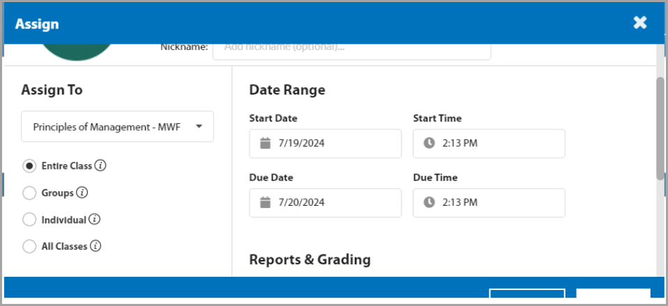 In the Assign menu, you can customize assignment settings for the entire class, for students in select groups, for select students, or across all classes (if applicable). You can set the start date, end date, and time for the activity.