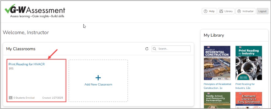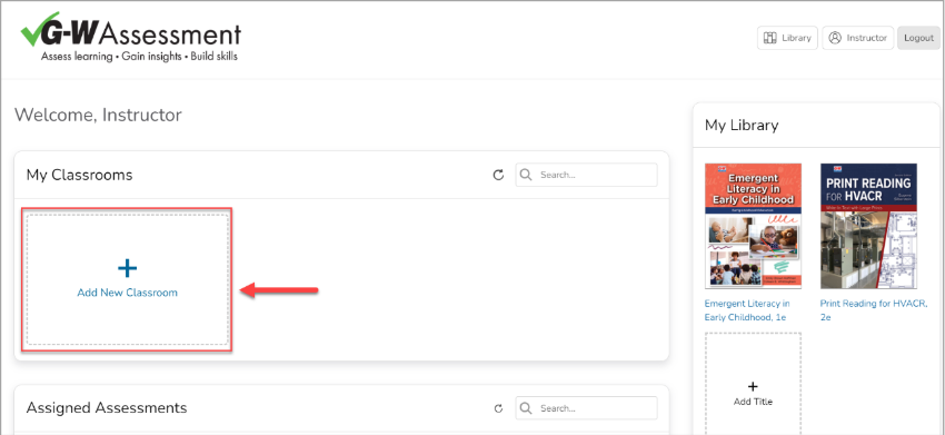 - Create a new class in G-W Assessment by selecting the "Add New Classroom" button.