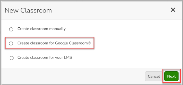 - A prompt will appear asking which type of class you wish to add. Select “Create Classroom for Google Classroom” and select “Next”.