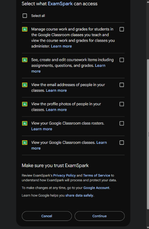 - The next window is to allow G-W Assessment to have access to specific areas of your Google Classroom to properly function. Choose the “Select All” check mark and click Continue.