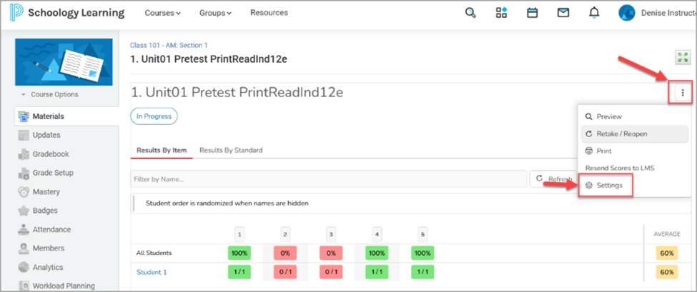 - Access your assessment settings by selecting on the “More Options” button and selecting “Settings.”