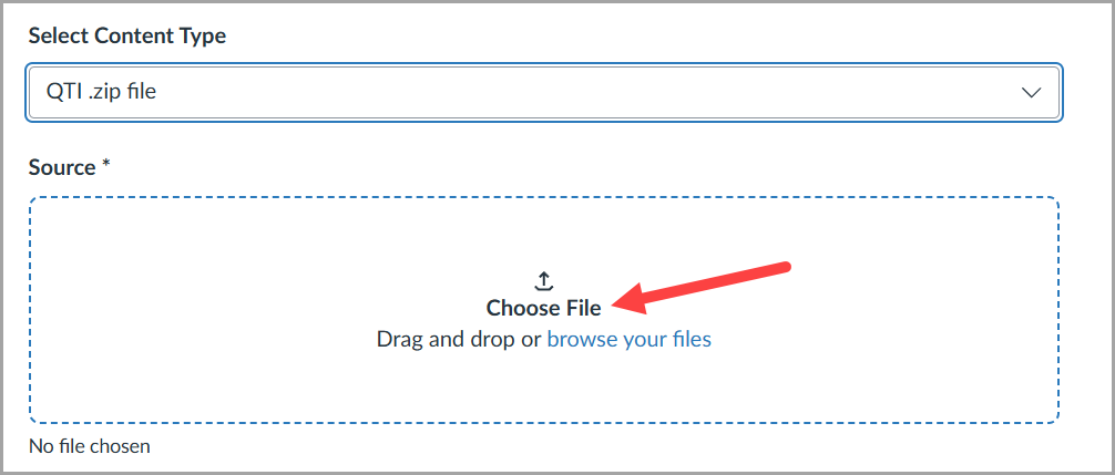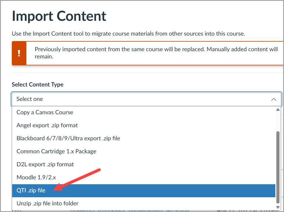 - Under Import Content, select the drop-down menu and choose QTI .zip file.