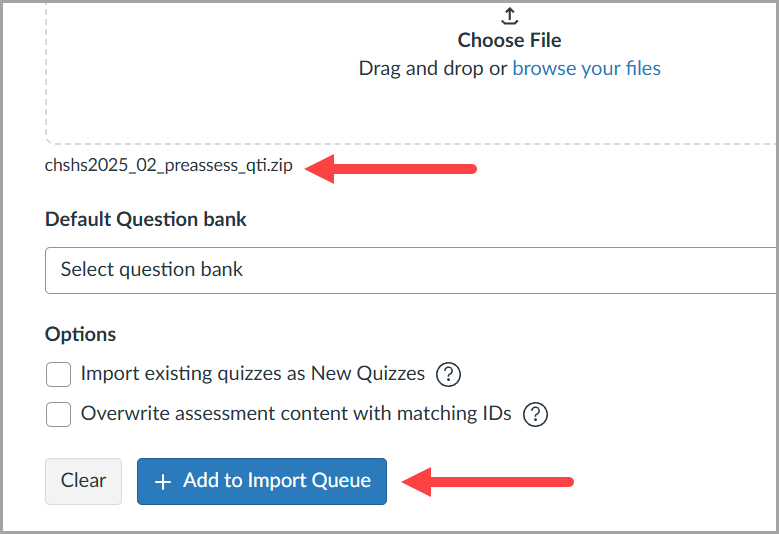 - Once it appears under "Choose File," select the + Add to Import Queue button.