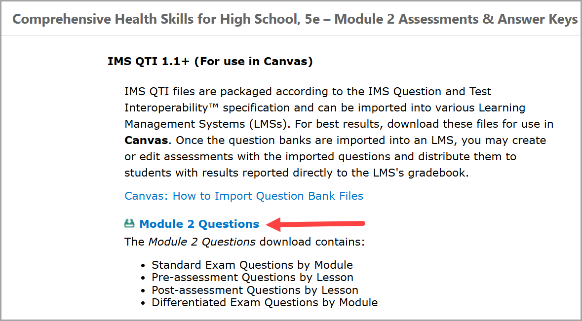 - Scroll down until you see the IMS QTI 1.1+ (For use in Canvas) section. There are a number of question bank files available for this title. Select Module 2 Questions link which is a .zip folder that will download to your local hard drive.