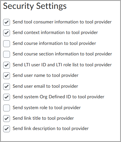 - Under Security Settings, leave the current boxes checked. Also check Send LTI user ID LTI role list to tool provider, Send username to tool provider, Send user email to tool provider, and Send system Org Defined ID to tool provider.