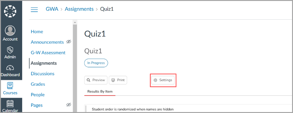 Some assessment policies must be adjusted directly within G-W Assessment to align with the assignment policies in Canvas. You can modify these settings by selecting the assignment after it has been created.