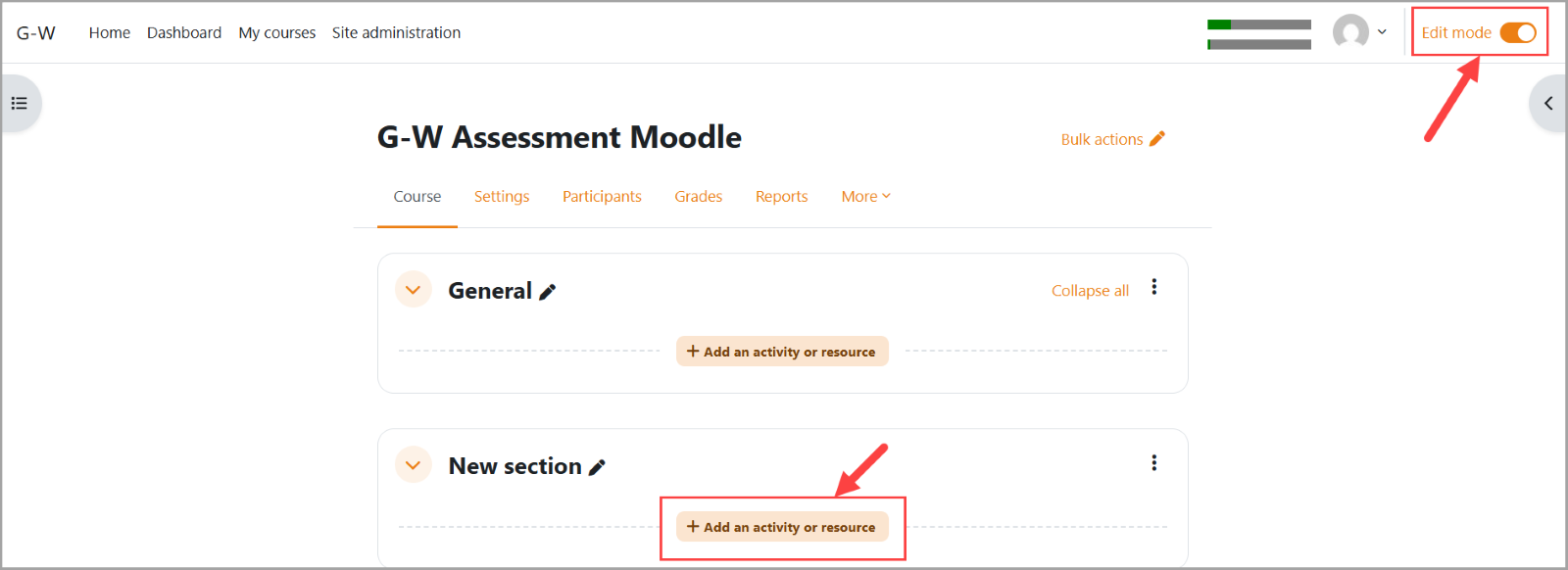 - Navigate to your course. Enable Edit mode then locate Add an activity or resource.