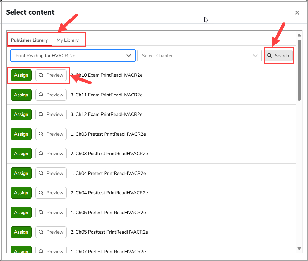 - The G-W Assessment content selection menu will display, allowing you to select your assessment. In this modal, use the dropdown menu to choose pre-built G-W assessment content from the Publisher Library, or select the My Library tab to access your existing assessment assignments. You can also use the Search feature to narrow your list.