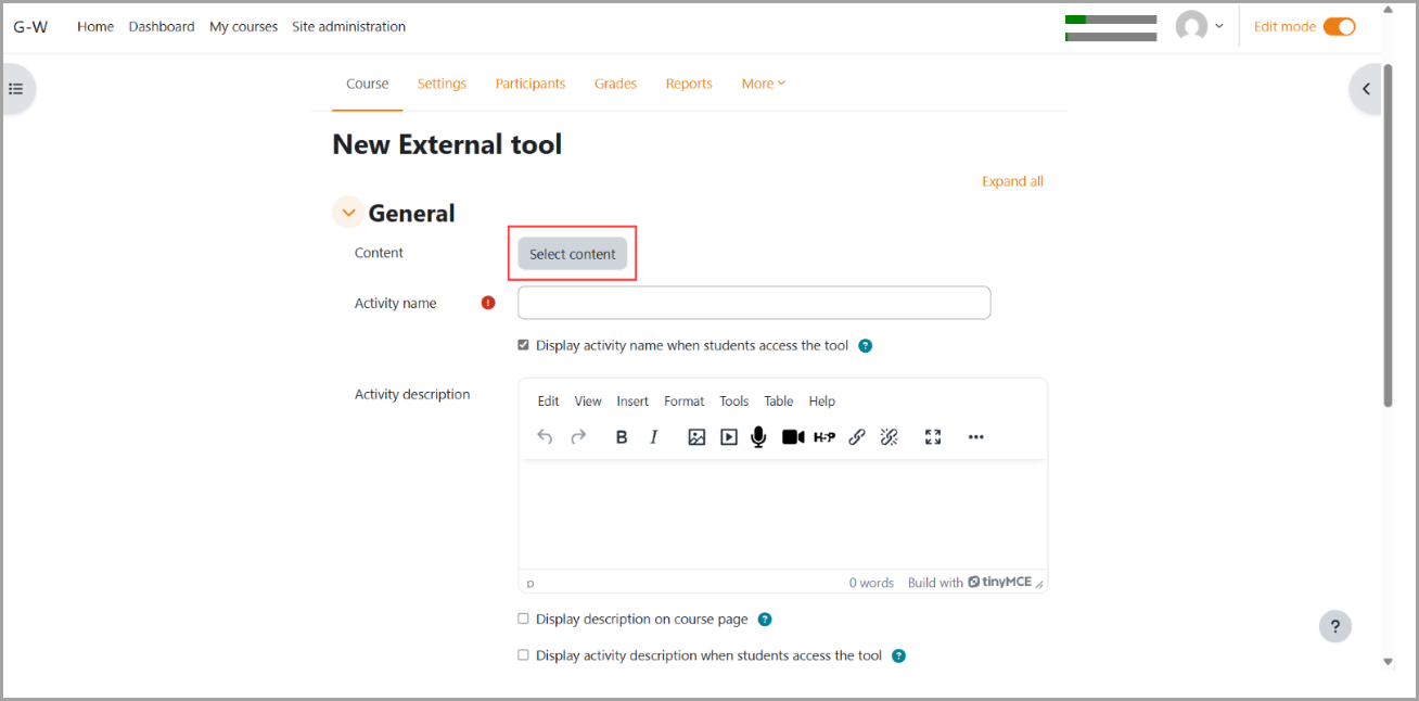 You will be returned to the New External tool page. Name the activity, make sure the checkbox for Display activity name when students access the tool is selected, apply any additional activity settings then select the Save and return to course button.