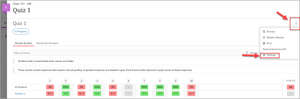 Access your assessment settings by selecting on the More Options button and then select Settings.
