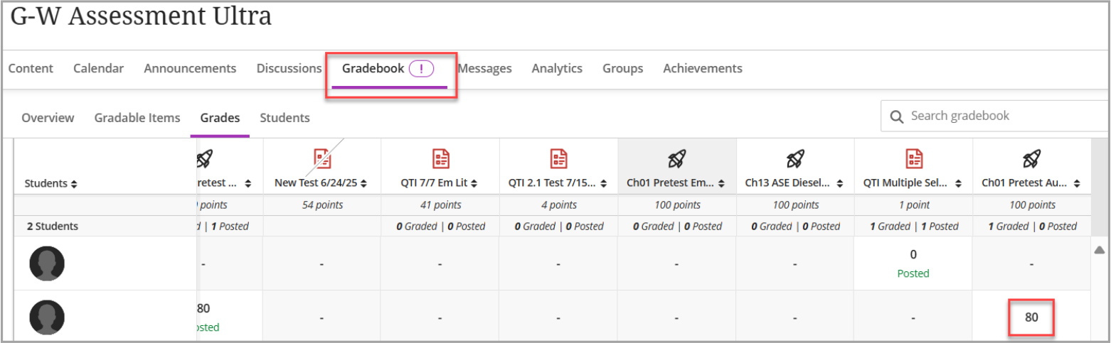 Manually adjusting a student’s score in the Blackboard Ultra Gradebook for a G-W Assessment assignment will break the automatic grade sync for that assignment. Once a grade is manually entered in Blackboard, it overrides the score sent from G-W Assessment, preventing any future updates from appearing in Blackboard.