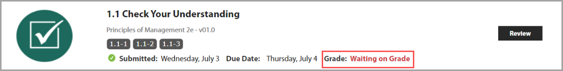- Some graded assignments, like short response questions and file attachments, take time for your instructor to review. You’ll see a Waiting on Grade message on the assignment tile until the grading process is complete.