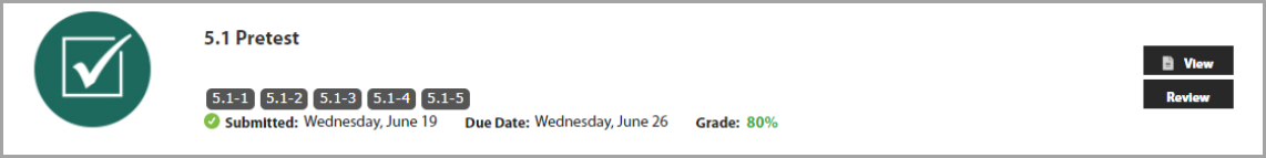 Assigned activities will show their status (submitted or not submitted), the due date, and your grade (if available). Grades may be available immediately after you complete your assignment, or they may be released later by your instructor.