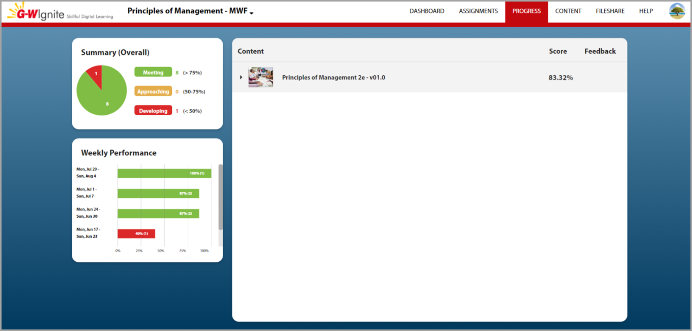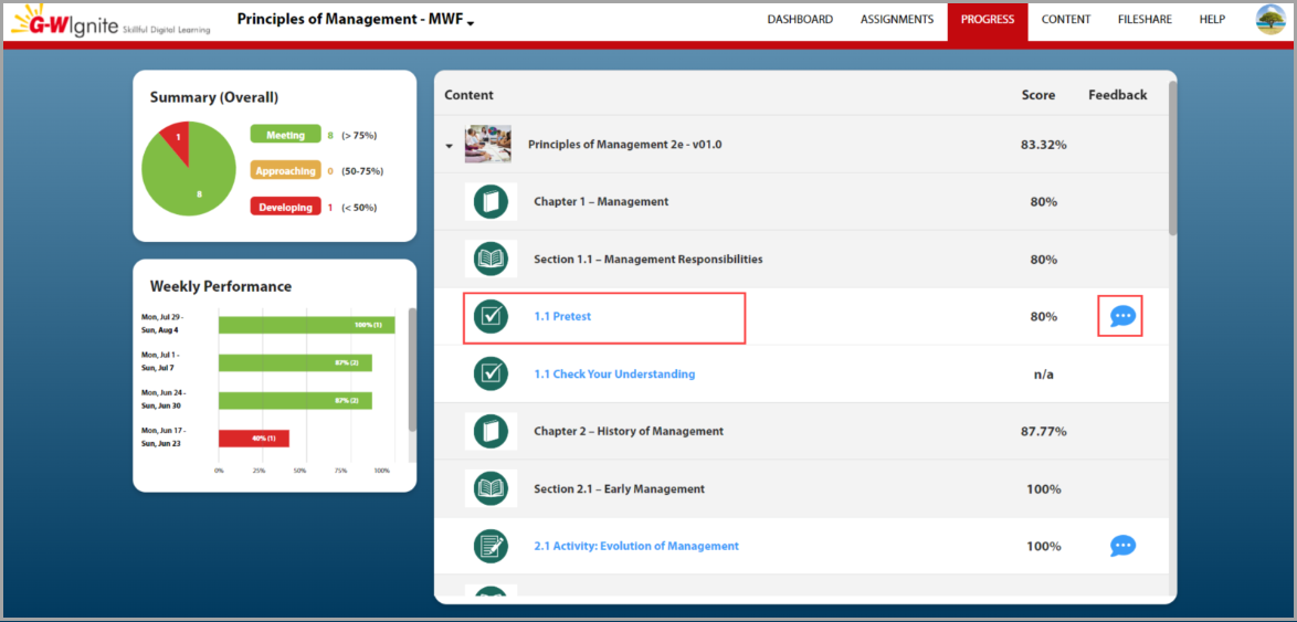 The Progress tab offers a detailed overview of your assignment results, allowing you to track your progress and identify areas for improvement.