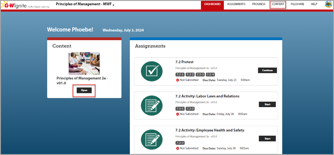 Under Content, click the Open button to explore the various activities (including the online text) available within each course folder. Your instructor might not assign every activity, but they are still available for you to explore as study tools or for practice.
